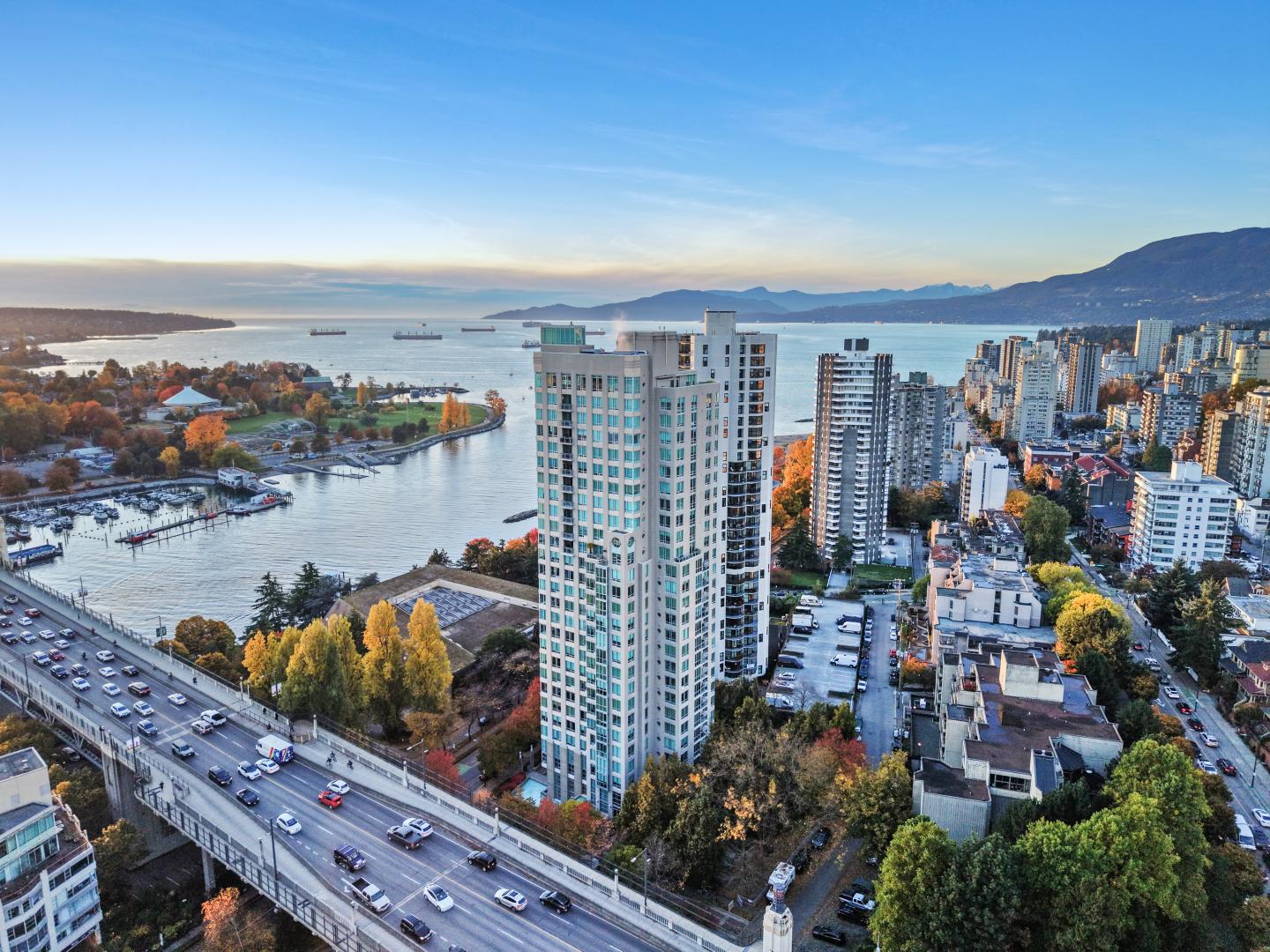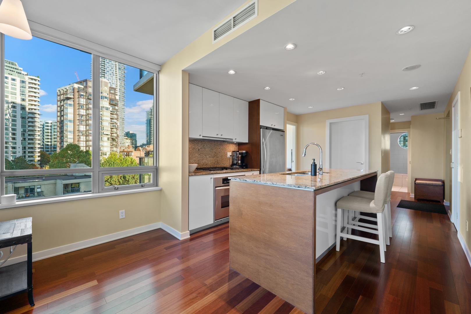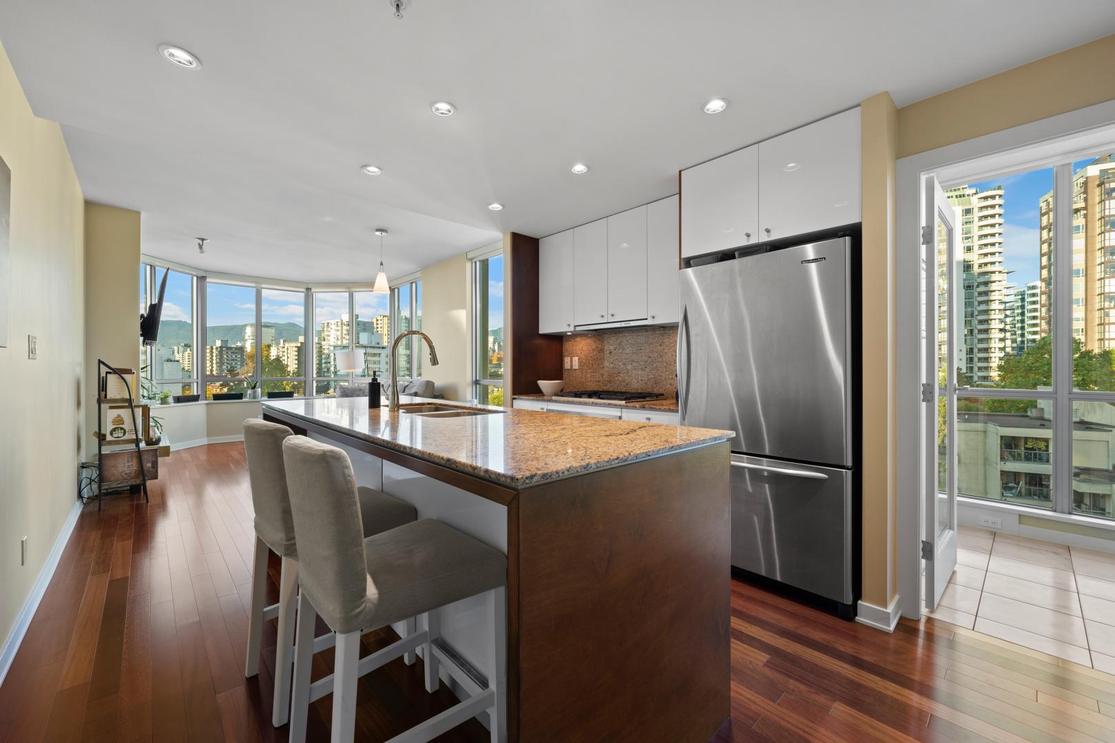 A rare offering in one of Vancouver’s most sought-after waterfront addresses. This exquisite residence at The Alvar exudes sophistication with its bright, open design, over-height ceilings, and expansive windows framing breathtaking city views. Enjoy your private balcony, perfect for morning coffee or evening sunsets. Impeccably finished with hardwood flooring, the gourmet kitchen is a showpiece featuring granite countertops, a generous island for casual dining. Central air conditioning ensures year-round comfort. Indulge in resort-style amenities including a jacuzzi, media and recreation lounges, pool table, conference facilities, and full security. Ideally positioned across from the Aquatic Centre, seawall, and minutes to Granville Island.
